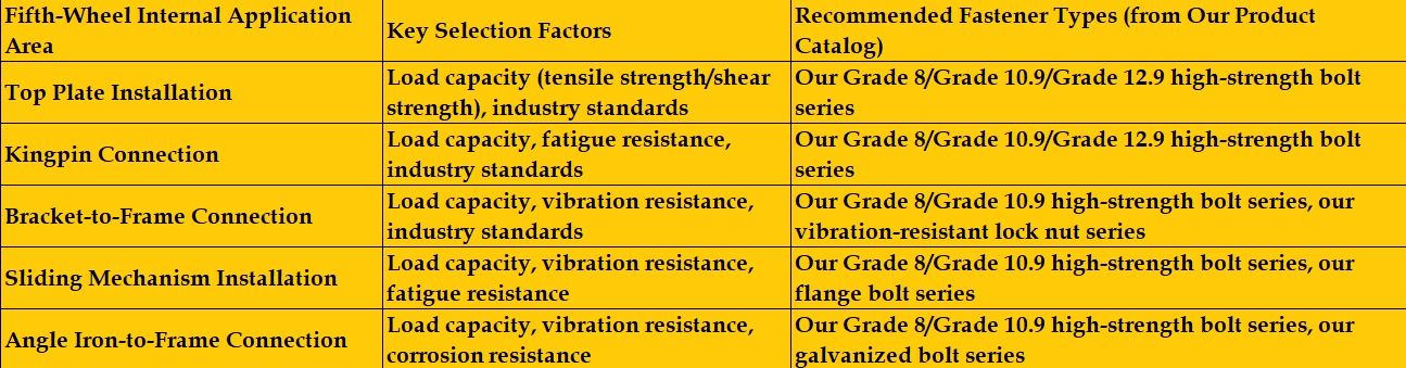 System piątego koła odgrywa kluczową rolę w łączeniu ciągnika i przyczepy, która jest niezbędna do bezpiecznego i wydajnego transportu. Prawidłowe wybór odpowiednich elementów mocujących jest niezbędne dla integralności i żywotności tego połączenia, bezpośrednio wpływającym na bezpieczeństwo i niezawodność operacyjną. Niniejszy biuletyn ma na celu prowadzenie klientów, w oparciu o katalog produktów naszej firmy, poprzez kluczowe czynniki, które należy wziąć pod uwagę przy wyborze elementów złącznych do zastosowań na piątym kołach.